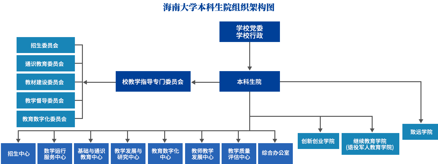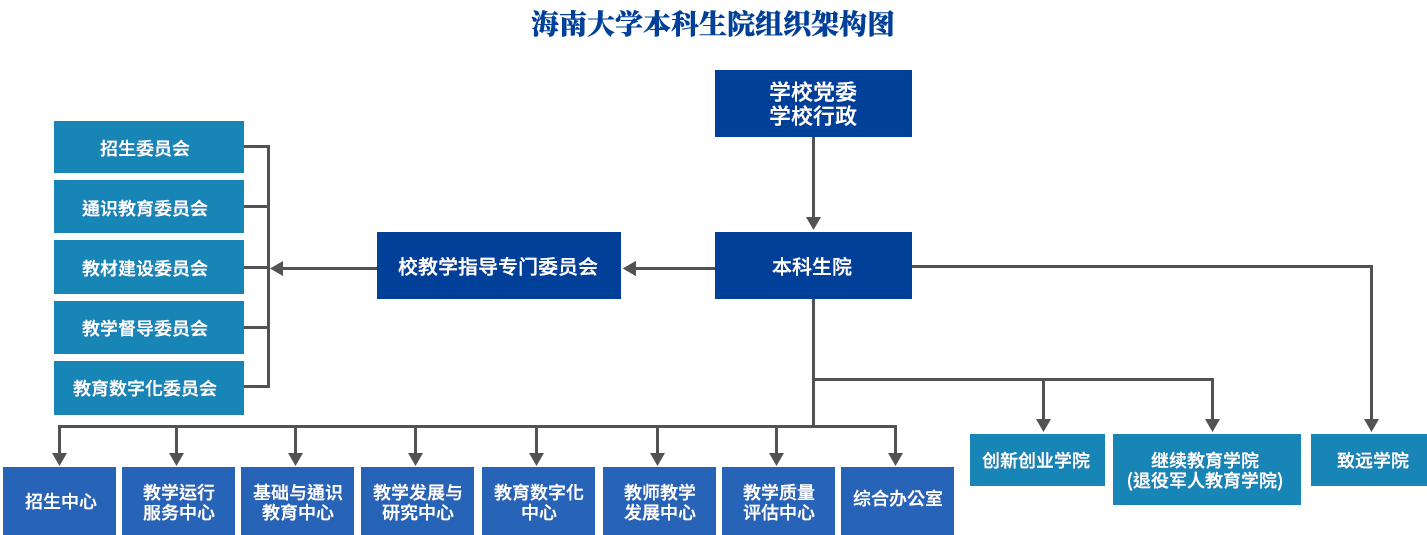 本科生院是在教务处(继续教育学院、创新创业学院、退役军人教育学院)、教学质量评估中心、招生考试中心等现有部门的基础上合并组建,纳入人事处教师发展中心和信息化服务中心部分职能,同时建设拔尖创新人才培养的特区一一“致远学院”,作为本科生院的“院中院”,负责一流学科突破计划选拔的优秀本科学生的本硕博一体培养等工作。