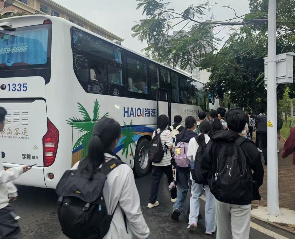 考虑到考试跨校区安排,为解决跨校区考生及监考人员的出行难题,开通“海甸校区-儋州校区”“海甸校区-观澜湖校区”“观澜湖校区城西教学点-观澜湖校区”三条考试专线,调配58辆大巴车组建专项运输车队。为师生提供便捷服务,实现了跨校区人员“点对点”安全高效接送,为考试顺利开展提供了坚实的交通后勤保障,展现了我校人文关怀。崖州书院组成的学生志愿者队,在崖州校区-崖城中学的两公里的全路段,手举指示牌为考生保驾护航。