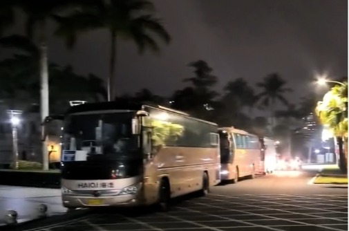 考生有序乘坐考试专线 凌晨6:20分,海甸校区-观澜湖校区监考员的班车已到位