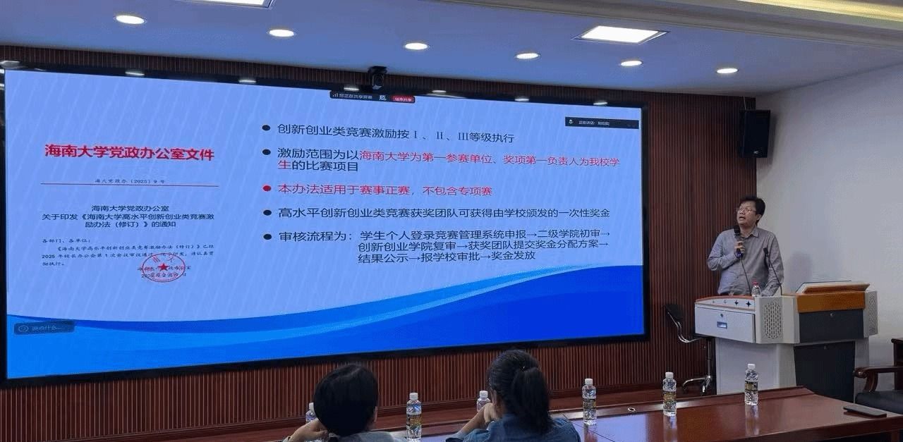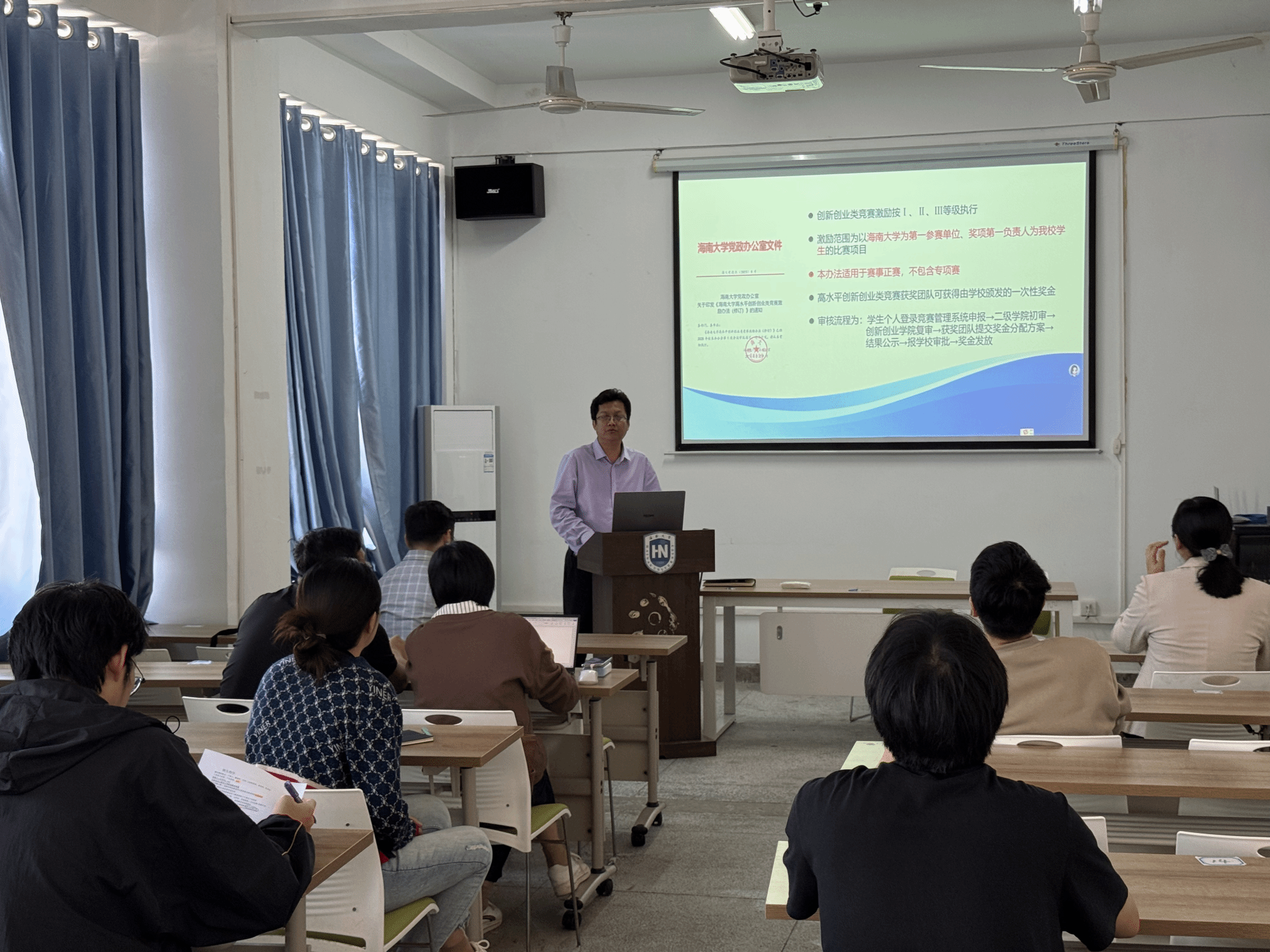 宣讲会围绕学校创新创业教育重点任务,系统解读了学校激励政策、中国国际大学生创新大赛最新动态以及海南大学创新创业学院十年发展历程三个方面内容。在学校激励政策方面,重点介绍了《海南大学高水平学科竞赛激励办法》,详细说明了竞赛成果在学生保研、学分认定以及教师职称评聘和岗位晋升中的具体支持措施。针对中国国际大学生创新大赛,宣讲会简要回顾了赛事发展历程与国家重视程度,并结合大赛主题,对赛事组织、参赛条件、赛制安排等关键环节进行了说明。在回顾创新创业学院十年发展时,重点分享了学院在深化创新创业教育改革中构建的“三位一体”实践平台体系,以及“抓团队、重实践、造氛围”的工作路径。