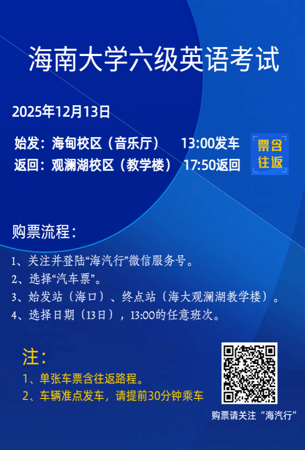 为解决跨校区考生交通问题,学校与海汽公司商议后提供以下方案,需要乘车的考生按需自愿购票(售票时间12月4日-12月11日),并在规定时间、地点乘车,届时海汽公司将根据购票情况派出车辆。