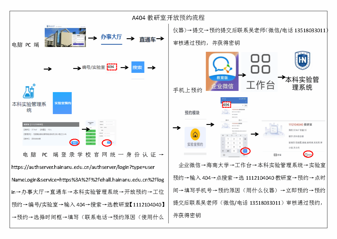 手机端预约流程:企业微信→海南大学→工作台→本科实验管理系统→实验室预约→输入404→点搜索→选1112104040教研室→预约→点时间→填写手机号→预约原因(用什么仪器)→立即预约→预约提交后联系吴老师(微信/电话13518033011)审核通过预约,并获得密钥。以下图A404教研室预约流程为例。共享仪器清单见附件: