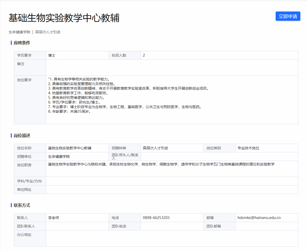 海南大学基础生物实验教学中心人才招聘岗位要求: