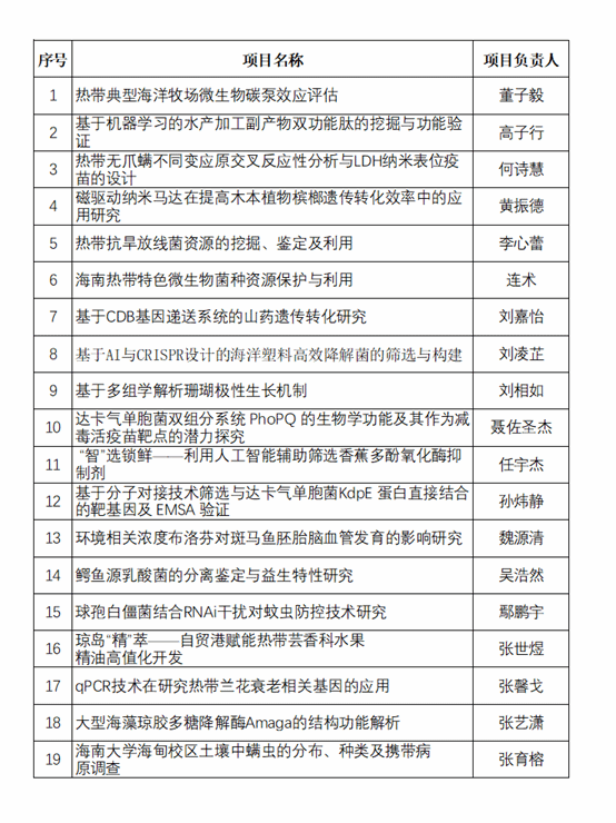 根据《关于开展 2025 年度大学生创新创业训练计划项目遴选通知》要求,依托基础生物实验教学中心组织申报、专家评审,拟定 19 个项目入选 2025 年度海南大学大学生创新训练计划项目(校级),具体名单公示如下: