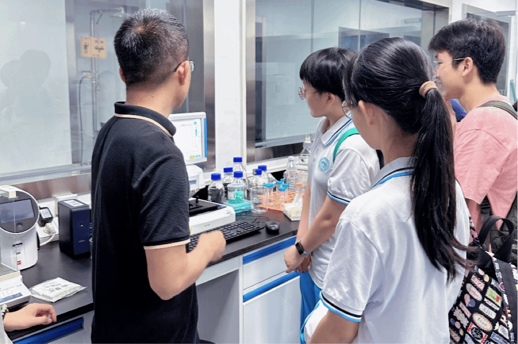 袁弘伦副教授带领同学们走进崖州湾国家实验室实验平台,介绍了高通量测序、代谢物检测等大型仪器的运行原理与应用场景,让大家对现代植物代谢研究的技术支撑有了直观认识。